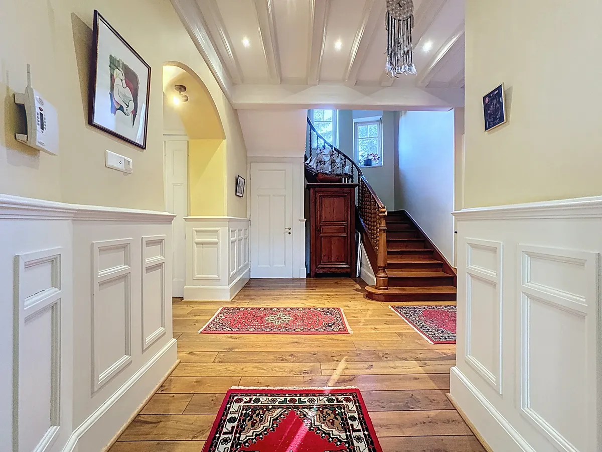 Le rez-de-chaussée s’ouvre sur un spacieux hall d’entrée avec armoires murales, annonçant immédiatement le caractère et les volumes de la maison. Les espaces de vie se composent d’une spacieuse salle à manger, d’un élégant séjour avec cheminée et d’une grande cuisine avec îlot central, le tout s’ouvrant harmonieusement sur les terrasses et le jardin. Deux grandes chambres, dont l’une avec cheminée, bénéficient d’un accès direct à une salle d’attente ornée de vitraux et disposant d’une entrée indépendante, idéale pour une activité professionnelle ou un espace privé. Un WC visiteurs complète ce niveau, pensé pour offrir un cadre de vie à la fois élégant, fonctionnel et convivial.