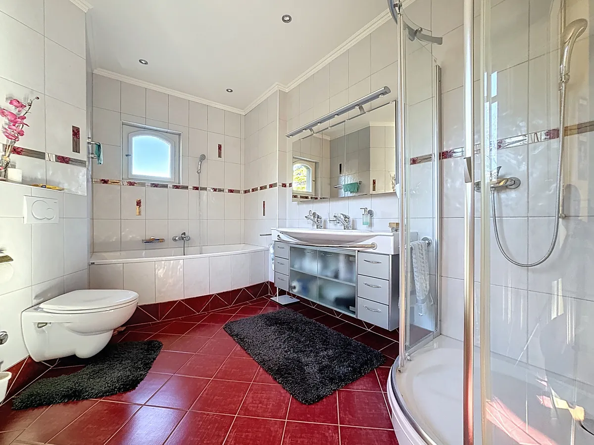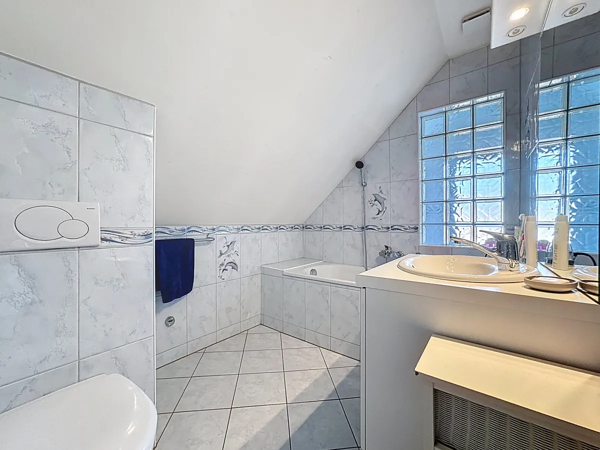 Le premier étage s’organise autour d’un élégant hall de distribution avec armoires murales et accès à une terrasse, desservant harmonieusement les espaces nuit et de vie. Il accueille une superbe suite parentale avec cheminée, salle de bains, douche et balcon privé, offrant un cadre intime et raffiné. Deux chambres à coucher supplémentaires, chacune avec accès balcon, complètent ce niveau, ainsi qu’un WC séparé. Ce niveau se distingue également par une vaste pièce d’environ 42 m², actuellement utilisée comme salle de cours, offrant un potentiel remarquable pour un home cinéma, une salle de loisirs ou un espace créatif selon les envies. Balcons et terrasse prolongent les espaces intérieurs vers l’extérieur et invitent à profiter pleinement du calme et de la vue, dans une atmosphère à la fois paisible et élégante.