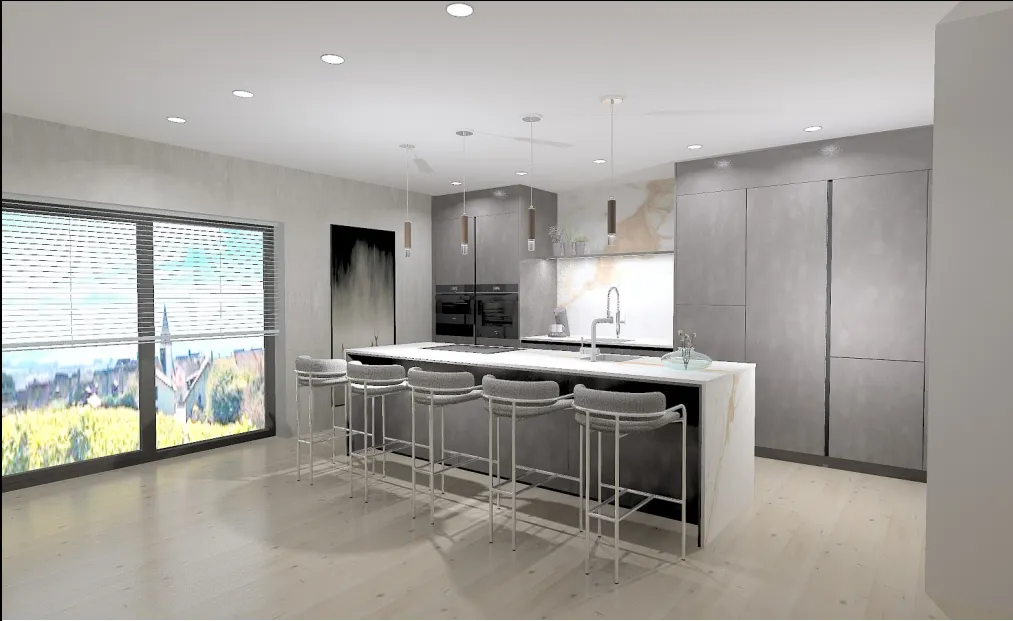 L’étage supérieur est le cœur vibrant de la maison : une vaste pièce de vie, baignée de lumière, où chaque instant prend une dimension particulière. Imaginez-vous rassemblés autour de la cheminée lors des soirées d’hiver, ou savourant un dîner convivial dans la salle à manger panoramique. La cuisine ouverte avec îlot central et cellier attenant devient le théâtre de vos plus beaux moments gourmands. À travers de larges baies vitrées, la vue s’étend sur le lac et les montagnes, et se prolonge naturellement vers la terrasse et le jardin paysager où les longues soirées d’été se savourent entre amis, face au coucher du soleil.