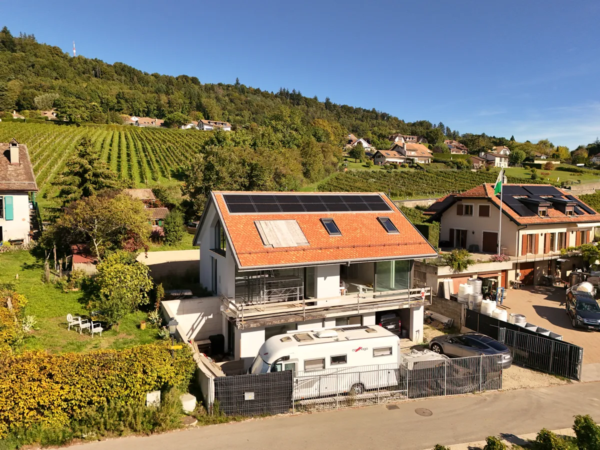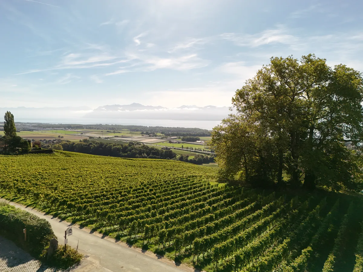 Nestled among preserved vineyards, just minutes from Rolle, Féchy, and Aubonne, this exceptional contemporary villa reveals itself. Built in 2025 on a 419 m² plot bordering the vineyard zone, it offers its future owners a rare privilege: living in absolute tranquility, with no vis-à-vis — only the lake stretches before you, with the majestic Alps as a backdrop.