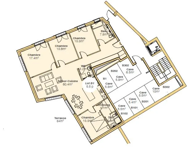 Spacieux appartement familial de 142.20 m², avec généreux espaces de vie et grande terrasse 84 m2.