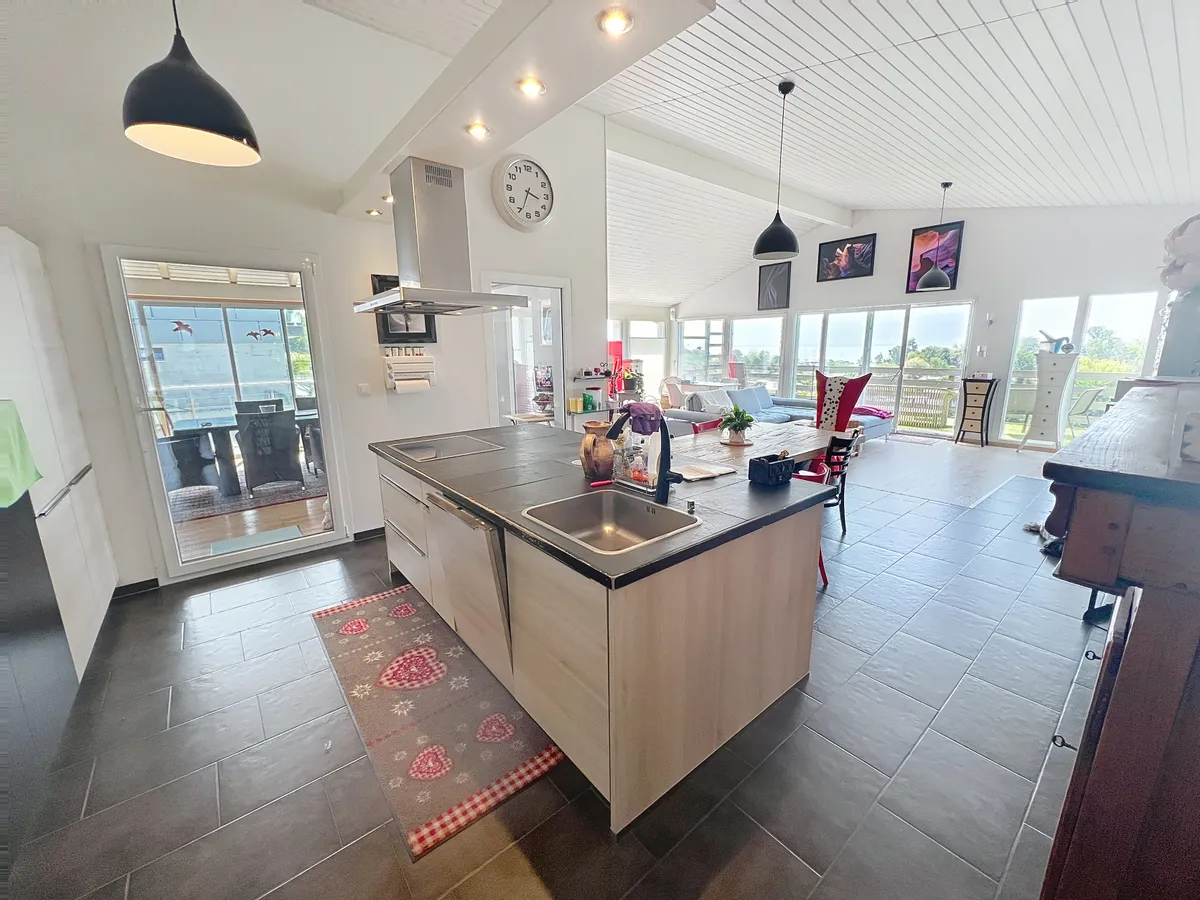 Dès l’entrée, un hall accueillant vous guide vers les espaces de vie soigneusement agencés. Vous découvrirez une vaste cuisine ouverte, idéale pour les moments conviviaux, prolongée par un espace de vie lumineux, suffisamment spacieux pour accueillir un double salon ou un salon et une salle à manger. Ce grand espace s’ouvre sur une magnifique terrasse de 36 m², orientée plein lac, offrant une vue dégagée à couper le souffle.
