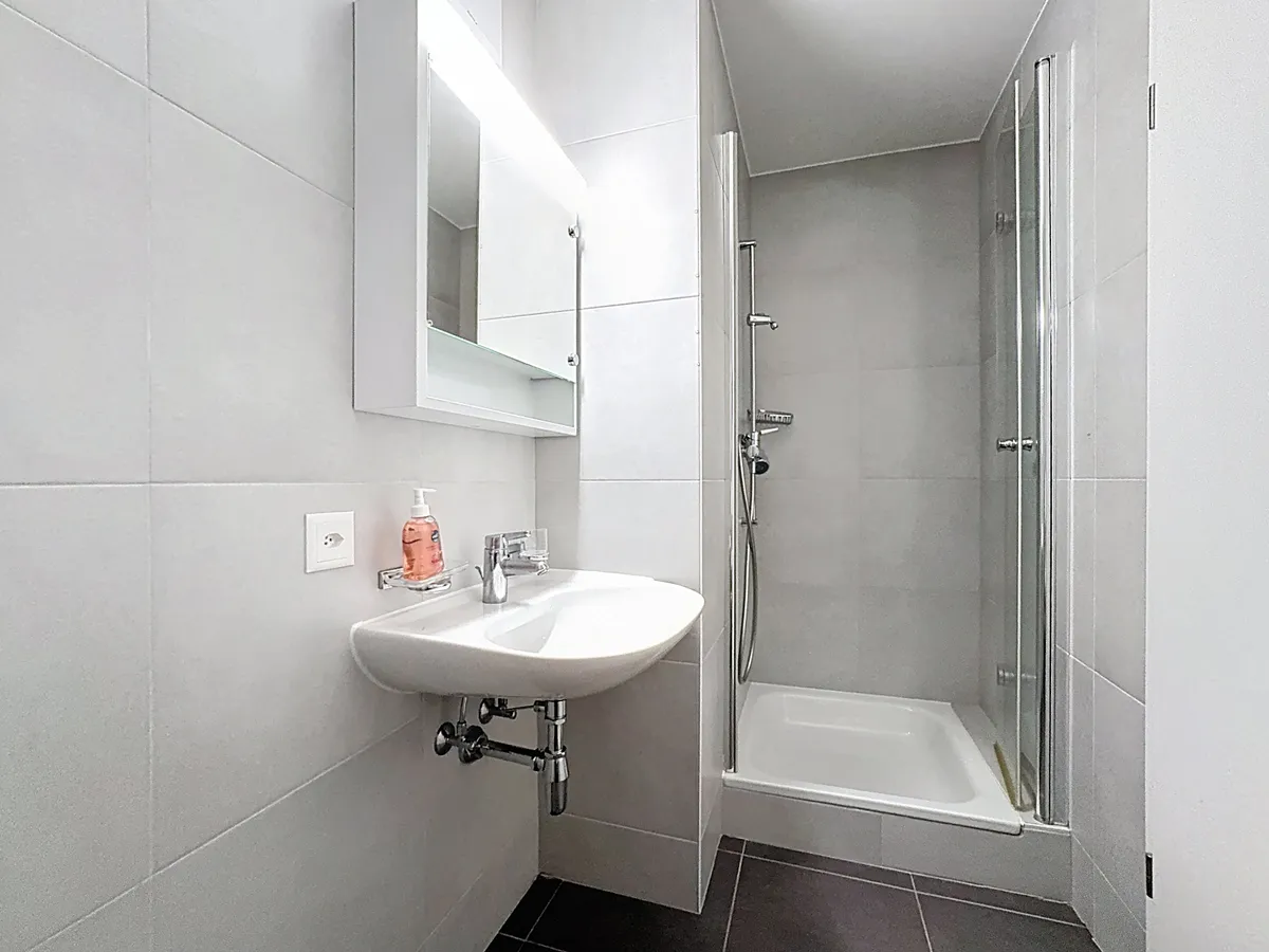 L’appartement propose une distribution particulièrement agréable, avec une première chambre située sur le niveau principal, au même étage que le séjour, accompagnée d’une salle de douche. L’étage supérieur accueille quant à lui deux chambres supplémentaires aux volumes généreux ainsi qu’une salle de bains équipée d’une baignoire et d’un meuble avec deux vasques, offrant un espace nuit confortable et plus intime.