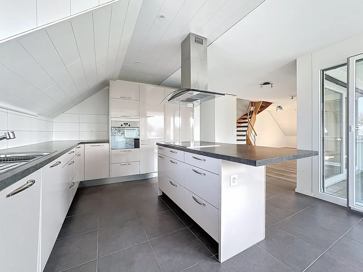 L’espace de vie principal offre un magnifique séjour avec salle à manger, baigné de lumière grâce à son exposition sud-ouest. La cuisine ouverte avec îlot central, entièrement équipée d’appareils haut de gamme V-Zug, s’intègre harmonieusement à cet espace convivial. Le séjour s’ouvre sur un très grand balcon de 26 m², véritable prolongement du salon, idéal pour profiter du panorama et de l’ensoleillement tout au long de la journée. Les stores électriques apportent un confort supplémentaire au quotidien.
