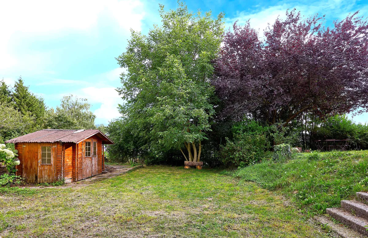 Extérieurs : grande parcelle arborée, deux terrasses, 1 cabanon de jardin, 1 garage fermé pour deux voitures